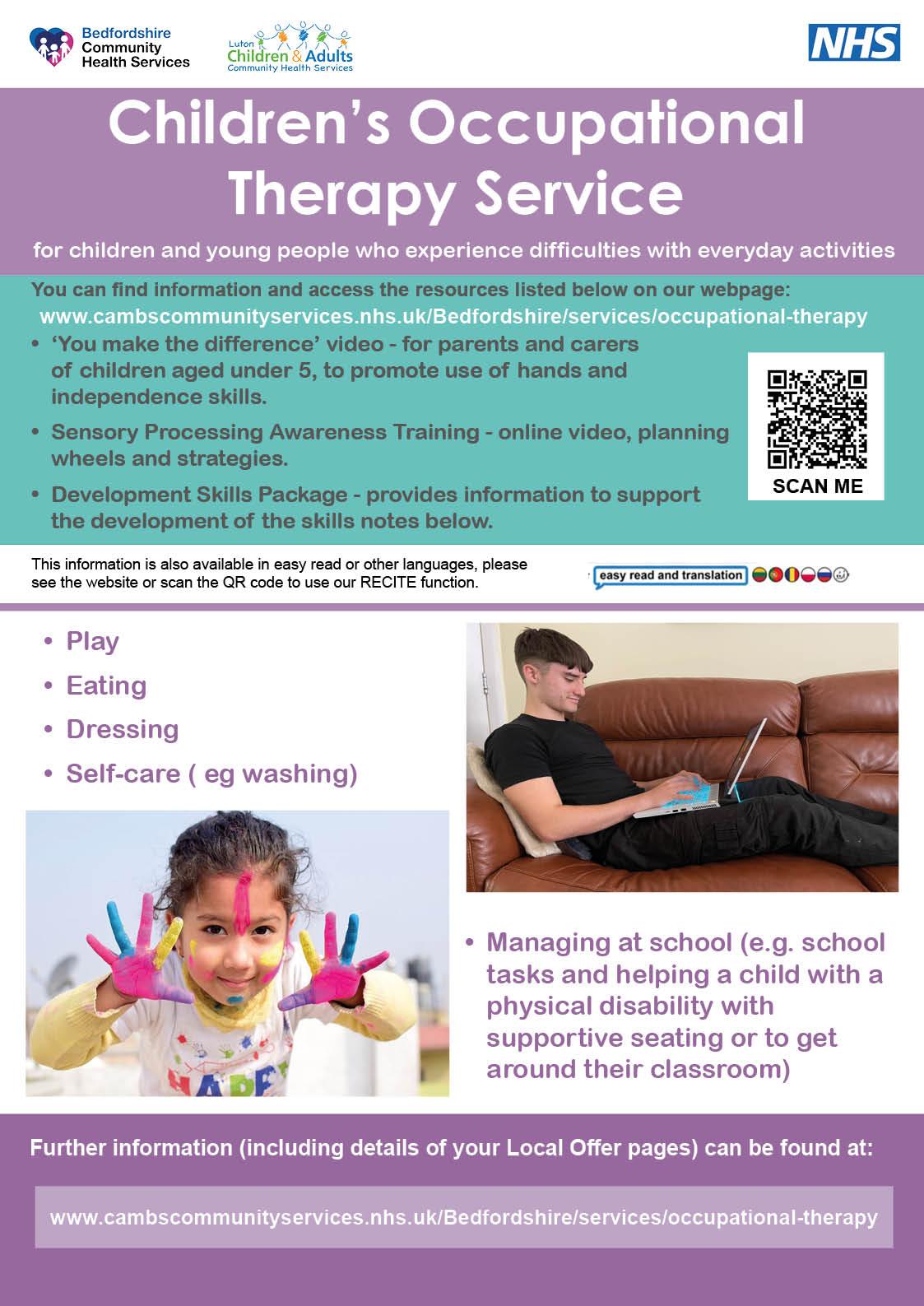 The Luton and Bedfordshire Paediatric Occupational Therapist service support children and young people to engage and participate as fully as possible in childhood occupations (activities) such as: