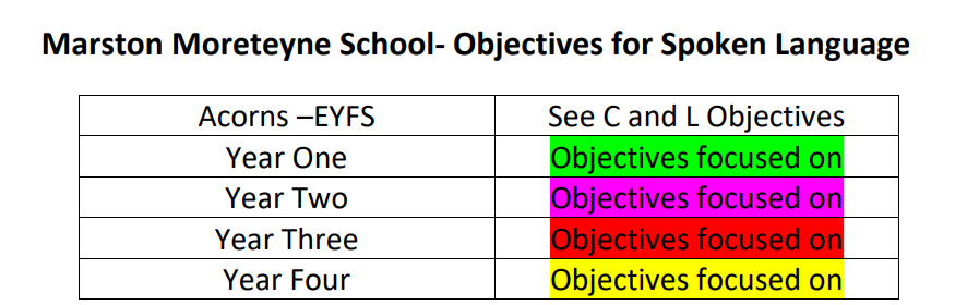 The teaching and implementation of the Spoken Language curriculum at Marston Moreteyne VC School is based on the Early Learning Goals and National Curriculum; it is supported by expectations from Classroom Monitor, ensuring a well-structured approach.