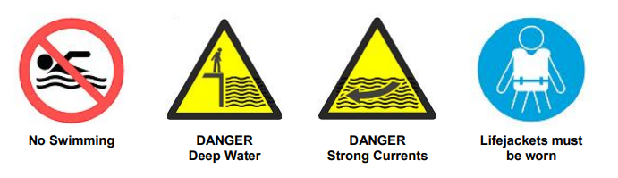 There are also national water safety signs that are used around the country.  These let the  you  know what  is  safe to do  on  the water and what the  dangers are.  They can  warn of dangers that the you may not be able to see.  Using the same signs around the  country means that  you  can  understand the messages  wherever you  are.   Some  examples  of  national water safety signs are: